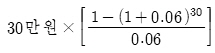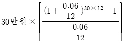 여기서 연금의 미래가치는 매월 말 30만원이므로, 연 6%의 이자율로 계산하면 다음과 같다.
