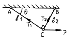 그림에서 ℓ1= 4m, ℓ2= 3m인 강봉 AC와 BC를 C점에서 핀으로 연결하고 수평하중 15000 N이 작용할 때 강봉 AC와 BC의 변형량은 각각 몇 mm 인가? (단, 강봉의 단면적은 7.06 mm2, 탄성계수는 200 GPa이다.)