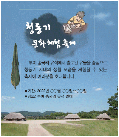 '청동기 문화 체험 축제'라는 제목 아래 '부여 송국리 유적에서 출토된 유물을 중심으로 청동기 시대의 생활 모습을 체험할 수 있는 축제에 여러분을 초대합니다'는 내용이 나와 있다.