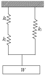 [과목 구분 없음] 그림과 같은 스프링 장치에 질량 W의 물체를 매달 때, 물체의 처짐량[mm]은? (단, k1=k2=100N/mm, k3=50 N/mm, W=200 kg이다)