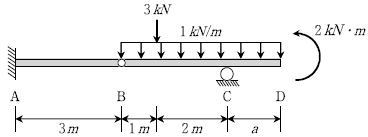 다음과 같이 하중을 받는 보에서 AB 부재에 부재력이 발생되지 않기 위한 CD 부재의 길이 a[m]는? (단, 자중은 무시한다)