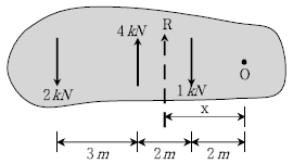 다음과 같이 구조물에 작용하는 평행한 세 힘에 대한 합력(R)의 O점에서 작용점까지 거리 x[m]는?