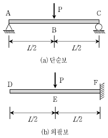 다음과 같이 길이 L인 단순보와 외팔보에 집중하중 P가 작용하고 있다. 단순보의 B점에 발생되는 수직처짐(δB)과 외팔보 E점에서 발생되는 수직처짐(δE)의 비교값(δE/δB)은? (단, 자중은 무시한다)