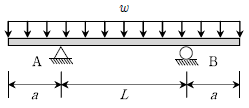 다음과 같이 양단 내민보 전 구간에 등분포하중이 균일하게 작용하고 있다. 이때 휨모멘트도에서 최대정모멘트와 최대부모멘트의 절댓값이 같기 위한 L과 a의 관계는? (단, 자중은 무시한다)
