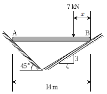 [과목 구분 없음] 그림과 같이 마찰이 없는 경사면에 보 AB가 수평으로 놓여있다. 만약 7 kN의 집중하중이 보에 수직으로 작용할 때, 보가 평형을 유지하기 위한 하중의 B점으로부터의 거리 x[m]는? (단, 보는 강체로 재질은 균일하며, 자중은 무시한다)