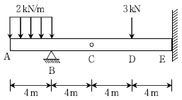 그림과 같은 게르버보에서 고정지점 E점의 휨모멘트[kNㆍm]의 크기는? (단, C점은 내부힌지이며, 자중은 무시한다)