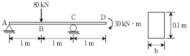 그림과 같이 내민보가 하중을 받고 있다. 내민보의 단면은 폭이 b이고 높이가 0.1m인 직사각형이다. 내민보의 인장 및 압축에 대한 허용휨응력이 600MPa일 때, 폭 b의 최솟값[m]은? (단, 자중은 무시한다)