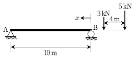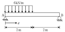 그림과 같은 단순보에서 최대 휨모멘트가 발생하는 곳의 위치 x[m]는? (단, 자중은 무시한다)