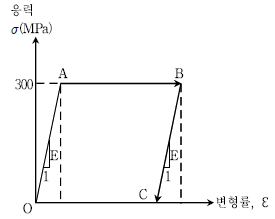 그림과 같은 응력-변형률 관계를 갖는 길이 1.5 m의 강봉에 인장력이 작용되어 응력상태가 점 O에서 A를 지나 B에 도달 하였으며, 봉의 길이는 15mm 증가하였다. 이때, 인장력을 완전히 제거하여 응력상태가 C점에 도달할 경우 봉의 영구 신장량[mm]은? (단, 봉의 응력-변형률 관계는 완전탄소성 거동이며, 항복강도는 300MPa이고 탄성계수는 E=200 GPa이다)