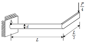 그림과 같이 길이 L인 원형 막대의 끝단에 길이 L/2의 직사각형 막대가 직각으로 연결되어 있다. 직사각형 막대의 끝에 P/4의 하중이 작용할 때, 고정지점의 최상단 A점에서의 전단응력은? (단, 원형 막대의 직경은 d이고, 자중은 무시한다)