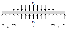그림과 같이 보는 등분포하중 q1과 q2에 의해 힘의 평형상태에 있다. 이 보의 최대 휨모멘트 크기[kN⋅m]는? (단, a=2 m, b=6m, q1=10 kN/m이며, 보의 자중은 무시한다)