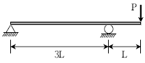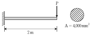그림과 같이 단면적 A=4,000mm2인 원형단면을 가진 캔틸레버 보의 자유단에 수직하중 P가 작용한다. 이 보의 전단에 대하여 허용할 수 있는 최대하중 P [kN]는? (단, 허용전단응력은 1N/mm2이다)