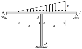 그림과 같은 부정정 구조물에 등변분포 하중이 작용할 때, 반력의 총 개수는? (단, B점은 강결되어 있다)