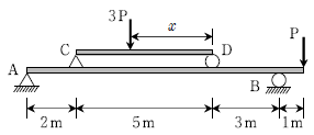 그림과 같이 길이 11 m인 단순보 위에 길이 5 m의 또 다른 단순보(CD)가 놓여 있다. 지점 A와 B에 동일한 수직 반력이 발생하도록 만들기 원한다면, 3P의 크기를 갖는 집중하중을 보 CD 위의 어느 위치에 작용시켜야 하나? (단, 지점 D에서 떨어진 거리 x(m)를 결정하며, 모든 자중은 무시한다)