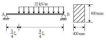 그림과 같은 하중이 작용하는 직사각형 단면의 단순보에서 전단력을 지지할 수 있는 지간 L의 최대 길이[m]는? (단, 보의 자중은 무시하고, 허용전단응력은 1.5MPa이다)