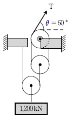 그림과 같이 배열된 무게 1,200 kN을 지지하는 도르래 연결 구조에서 수평방향에 대해 60°로 작용하는 케이블의 장력 T[kN]는? (단, 도르래와 베어링 사이의 마찰은 무시하고, 도르래와 케이블의 자중은 무시한다)