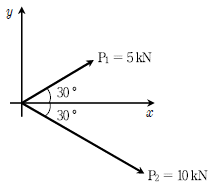 그림과 같은 xy 평면상의 두 힘 P1, P2의 합력의 크기[kN]는?