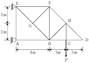 그림과 같은 트러스 구조물에서 C점에 수직하중이 작용할 때, 부재 CG와 BG의 부재력(FCG, FBG)[kN]은? (단, 트러스의 자중은 무시한다) (순서대로 FCG, FBG)