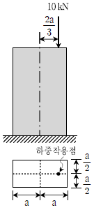 그림과 같은 편심하중을 받는 짧은 기둥이 있다. 허용인장응력 및 허용압축응력이 모두 150MPa일 때, 바닥면에서 허용응력을 넘지 않기 위해 필요한 a의 최솟값[mm]은? (단, 기둥의 좌굴 및 자중은 무시한다)