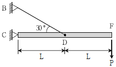 그림과 같이 강체로 된 보가 케이블로 지지되고 있다. F점에 수직하중 P가 작용할 때, F점의 수직변위의 크기는? (단, 케이블의 단면적은 A, 탄성계수는 E라 하고, 모든 부재의 자중은 무시하며 변위는 미소하다고 가정한다)
