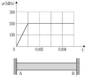 그림과 같이 양단이 고정되고, 일정한 단면적(200mm2)을 가지는 초기 무응력상태인 봉의 온도변화(△T)가 -10 °C일 때, A점의 수평 반력의 크기[kN]는? (단, 구조물의 재료는 탄성-완전소성거동을 하고, 항복응력은 200MPa, 초기탄 성계수는 200 GPa, 열팽창계수는 5 × 10-5/ °C 이며 좌굴 및 자중은 무시한다)