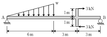 그림과 같은 하중을 받는 단순보에서 B점의 수직반력이 A점의 수직반력의 2배가 되도록 하는 삼각형 분포하중 w[kN/m]는? (단, 보의 자중은 무시한다)