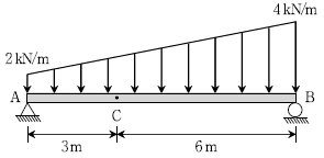 그림과 같은 분포하중을 받는 단순보에서 C점에서 발생하는 휨모멘트의 크기[kNㆍm]는? (단, 보의 자중은 무시한다)