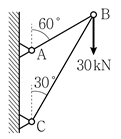 그림과 같이 2개의 부재로 연결된 트러스에서 B점에 30kN의 하중이 연직방향으로 작용하고 있을 때, AB 부재와 BC 부재에 발생하는 부재력의 크기 FAB[kN]와 FBC[kN]는?(순서대로 FAB, FBC)