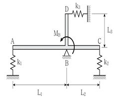그림과 같이 하중을 받는 스프링과 힌지로 지지된 강체 구조물에서 A점의 변위[mm]는? (단, MB=30Nㆍm, k1=k2=k3=5kN/m, L1=2m, L2=L3=1m, 구조물의 자중은 무시하며 미소변위이론을 사용한다)