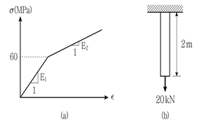 그림 (a)와 같은 이중선형 응력변형률 곡선을 갖는 그림 (b)와 같은 길이 2m의 강봉이 있다. 하중 20kN이 작용할 때 강봉의 늘어난 길이[mm]는? (단, 강봉의 단면적은 200mm2이고, 자중은 무시하며, 그림 (a)에서 탄성계수 E1=100GPa, E2=40GPa이다)