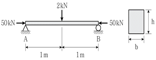 그림과 같은 하중을 받는 단순보에서 인장응력이 발생하지 않기 위한 단면 높이 h의 최솟값[mm]은? (단, h=2b, 50kN의 작용점은 단면의 도심이고, 보의 자중은 무시한다)