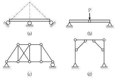 [과목 구분 없음] 그림 (a)~(d)와 같은 구조물 중 불안정 구조물의 개수는?