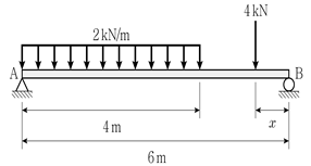 그림과 같이 하중이 작용하는 단순보의 지점 A, B의 반력이 같기 위한 x[m]는? (단, 구조물의 자중은 무시한다)