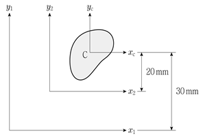 그림과 같이 도심이 C인 단면의 단면적(A)이 100mm2이고, x1축에 대한 단면 2차 모멘트(Ix1)가 100,000mm4일 때, x2축에 대한 단면 2차 모멘트(Ix2)의 크기[mm4]는?