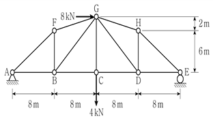 그림과 같이 트러스에 하중이 작용할 때, 부재 EH의 부재력[kN]은? (단, 구조물의 자중은 무시한다)