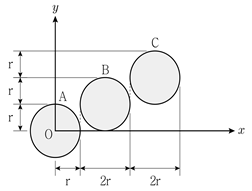 그림과 같이 반지름 r인 원이 각각 다른 위치에 있을 때, 점 O에 대한 원형 단면 A, B, C의 각각 극관성모멘트의 비 (IPO)A : (IPO)B : (IPO)C는?