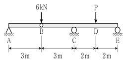 그림과 같이 게르버보에 집중하중이 작용하여 E점의 상향 수직반력의 크기가 2kN일 때, 하중 P의 크기[kN]는? (단, 구조물의 자중은 무시한다)