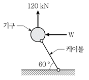 그림과 같이 지면에 케이블로 고정한 기구가 부양력 120kN과 수평풍하중(W)에 의해 케이블 각도가 60°에서 정지상태를 유지할 때, 케이블의 장력 T의 크기[kN]는? (단, 케이블의 형상은 선형이다)