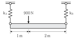 그림과 같이 스프링으로 지지된 균일 단면의 강체보에 하중 900N이 작용하여 수평을 유지할 때, 스프링 강성 kB[kN/m]는? (단, 스프링 강성 kA=5kN/m이고, 구조물의 자중은 무시한다)