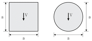그림과 같은 정사각형 및 원형 단면에 같은 크기의 전단력 V가 작용할 때, 단면에 발생하는 최대전단응력의 비(