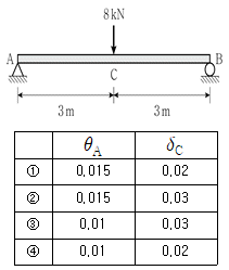 그림과 같은 단순보에서 A점의 회전각 θA[radian]와 C점의 처짐 δC[m]는? (단, 보의 휨강성 EI=1,200kNㆍm2이고, 구조물의 자중은 무시한다)