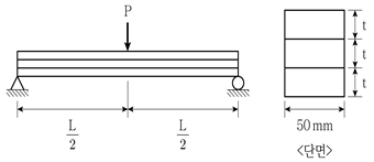 그림은 두께 t인 판 3개를 접착시켜 제작한 단순보에 하중 P를 '0'에서부터 서서히 증가시키는 실험을 나타낸다. 만일 P=9kN일 때 접착면 전단파괴가 발생하였다면, 판의 두께 t[mm]는? (단, 접착면의 전단강도는 5MPa이고, 전단파괴 이전에 접착면 미끄러짐은 발생하지 않으며, 구조물의 자중은 무시한다)