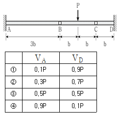 그림과 같이 게르버보에 집중하중 P가 작용할 때, A점과 D점의 전단력의 크기 VA, VD는? (단, 구조물의 자중은 무시한다)