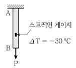 그림과 같은 부재에서 초기 축방향 변형률은 스트레인 게이지에 의해 0으로 측정되었다. 이후로 B점의 하중 P와 주변 온도 변화 △T=-30°C으로 인하여 축방향 변형률이 +2400×10-6으로 측정되었다면, 이때 부재의 축방향 응력[MPa]은? (단, 탄성계수 E=100GPa, 열팽창계수 α=20×10-6/°C이며, 부재의 자중은 무시한다)