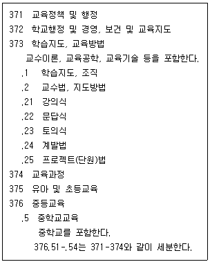 [과목 구분 없음] KDC 제6판의 본표 일부를 발췌한 것이다. 이를 적용한 「중학교에서의 프로젝트 교수법」의 분류기호로 옳은 것은?