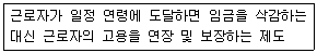 위 그림은 임금피크제를 나타내고 있습니다. 임금피크제란 기업이 일정 기간 동안 임금을 인상하지 않고 유지하다가 그 기간이 지나면 큰 폭으로 인상하는 제도입니다. 이는 기업이 경제적으로 어려운 시기에는 비용을 절감하고, 좋은 성과를 내면 보상을 주는 방식으로 인센티브를 제공하는 것과 같은 원리입니다. 따라서, "임금피크제"가 정답입니다.