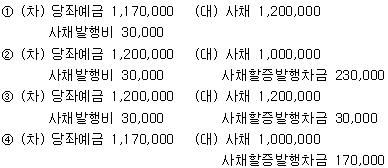 [재무회계의 이해] (주)A 2015년 7월 25일 액면가액이 \1,000,000인 사채를 \1,200,000에 발행하면서 사채발행비 \30,000을 차감한 잔액을 당좌예금 계좌로 입금 받았다. 이 거래에 대한 올바른 회계처리는?