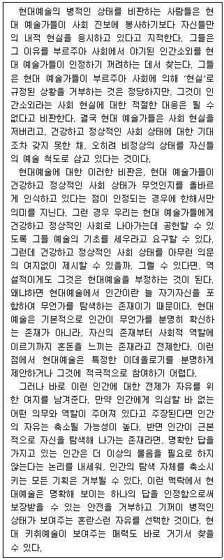 - ② 현대예술은 건강하고 정상적인 사회 상태가 무엇인지를 올바르게 인식하고 있다.