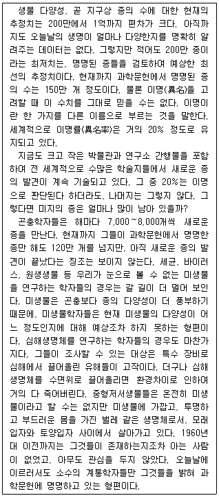 - 과학문헌에 기재된 종들 중에서 실제로 존재하는 종들의 수는 명명된 종들의 수보다 적다.