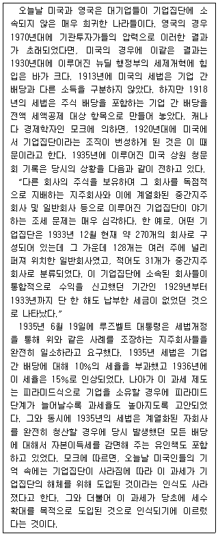 미국 기업집단의 해체는 세수 증대의 방편 중 하나로 이루어지고 있으며, 이는 루즈벨트 대통령이 시행한 세제개혁에서 당근과 채찍을 모두 포함한 것이었기 때문이다. 또한, 글에서는 세계적으로 기업집단에 속한 대기업이 많다는 것과 미국의 1918년 세법과 1936년 세법이 기업 간 배당에 대해 각기 상이한 과세원칙을 적용했다는 것도 언급되었다.